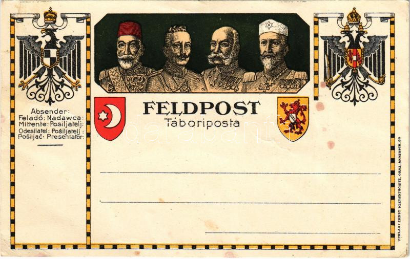 Első világháborús tábori postai levelezőlap a Központi Hatalmak uralkodóival: V. Mehmed, I. Ferdinánd, II. Vilmos, I. Ferenc József / WWI Austro-Hungarian K.u.K. military field postcard, Viribus Unitis and Central Powers propaganda: Mehmed V, Ferdinand I of Bulgaria, Wilhelm II, Franz Joseph I of Austria. Ernst Klementschitz Feldpostkarte (EK)