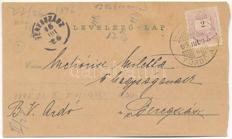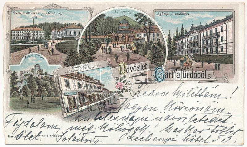 1896 (Vorläufer) Bártfa, Bártfafürdő, Bardejovské Kúpele, Bardiov, Bardejov; Deák szálloda és az új fürdőház, Főforrás, Széchenyi szálloda, Zborói várrom, Tachy udvar az Eschwig féle üzlettel, cukrászda / spa, hotel, bath, spring source, castle ruins (Zborovsky hrad), shop, confectionery. Karl Schwidernoch. Art Nouveau, floral, litho (vágott / cut)