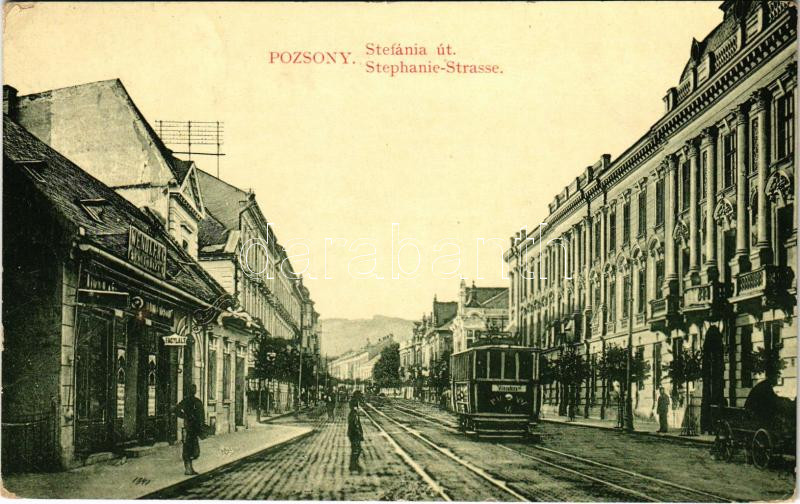 1910 Pozsony, Pressburg, Bratislava; Stefánia út, villamos a Vitéz utc... https://www.darabanth.com/en/41-Major-auction/41.1/Postcards/Slovakia~16960/1910-Pozsony-Pressburg-Bratislava-Stefania-ut-villamos-a-Vitez-utca-fele-Wendler-G-sutoh~II2981789