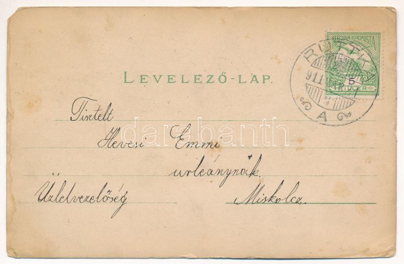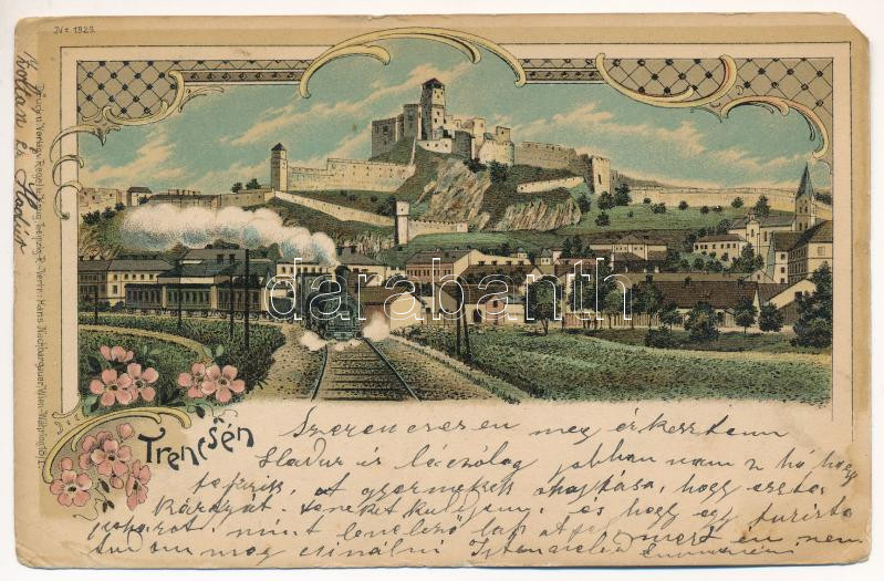 Description: 1911 Trencsén, Trencín; vasút a vár alatt, gőzmozdony, vonat / railway under the castle, train, locomotive. Regel u. Krug Art Nouveau, floral, litho (EM)