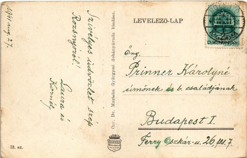 1941 Rozsnyó, Roznava; Rákóczi tér, Szántó A. és társa, Banton divatáruház, Tatra Drogueria, Gyógyszertár a Szentháromsághoz, piac. Özv. Dr. Mariska Györgyné kiadása / square, shops, pharmacy, drugstore, market, automobiles (EK)
