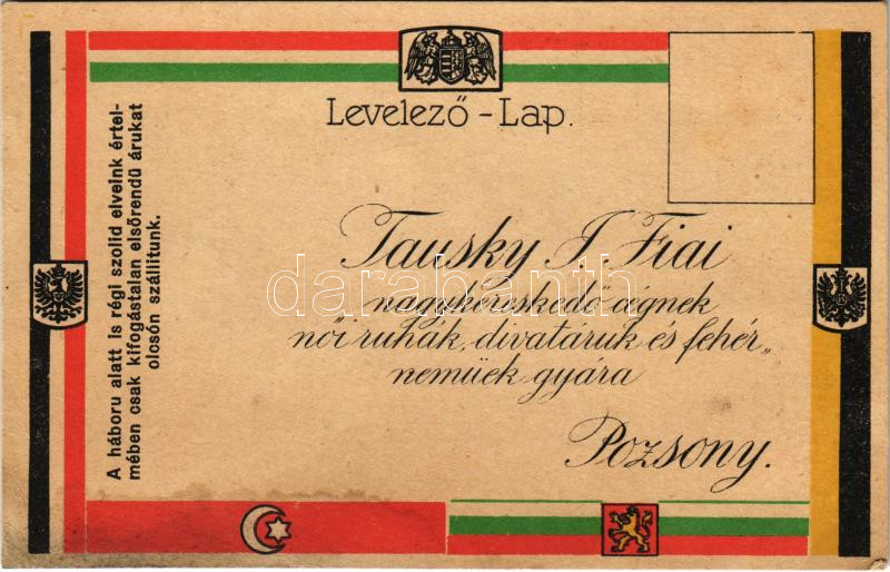 Description: Pozsony, Pressburg, Bratislava; Tausky J. fiai nagykereskedő cége és női ruha divatáru és fehérnemű gyára. Reklámlap a háború alatti időkből, Központi hatalmak zászlói és címerei / Hungarian women fashion and lingerie shop advertisement from WWI, Central Powers flags and coats of arms, propaganda (EK)