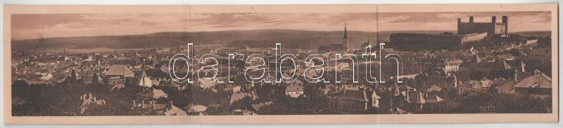Description: Pozsony, Pressburg, Bratislava; látkép, vár, régi ortodox zsinagóga. 3-részes kihajtható panorámalap / 3-tiled folding panoramacard with castle, old Orthodox synagogue