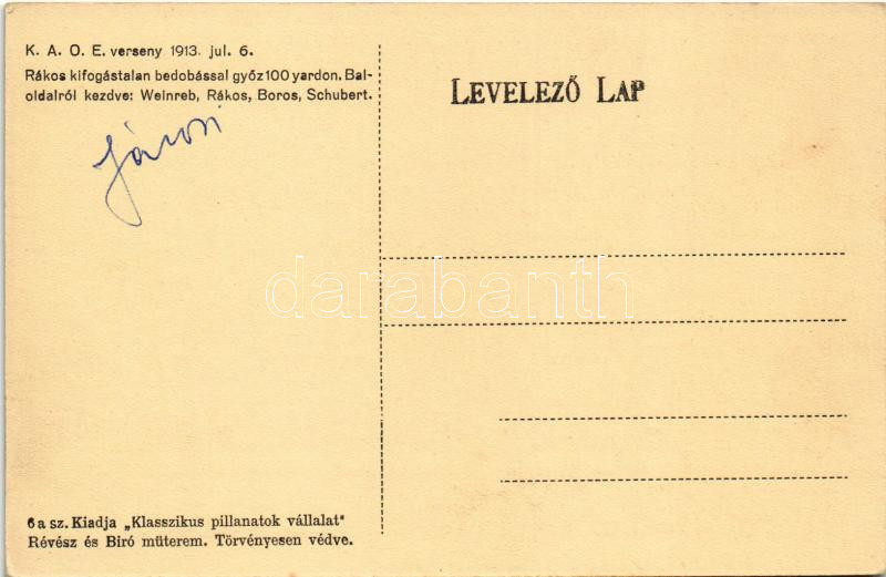 1913 július 6. K.A.O.E. verseny: Rákos kifogástalan bedobással győz 10... https://www.darabanth.com/en/41-Major-auction/41.1/Postcards/Sport~16994/1913-julius-6-KAOE-verseny-Rakos-kifogastalan-bedobassal-gyoz-100-yardon-Weinreb-Rako~II3008459