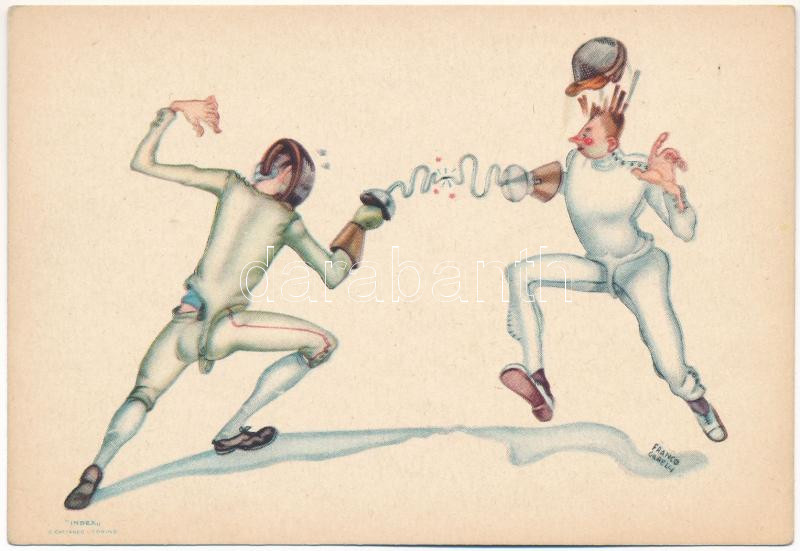 Description: Littoriali Torino V Giuochi Universitari Internazionali 1933 / G.U.F. University International Games, fencing, humour / Vívás, olasz sport humor s: Franco Garelli