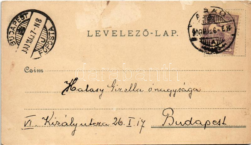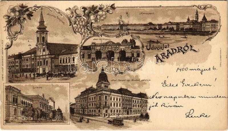1900 Arad, Minorita templom, vár főkapuja, Maros-part, Lyceum, Arad-Csanádi egy. Vasutak palotája, lóvasút. Lengyel Lipót kiadása / Minorite church, castle gate, Mures riverside, grammar school, railway palace, horse-drawn tram. Art Nouveau, floral, litho (Rb)