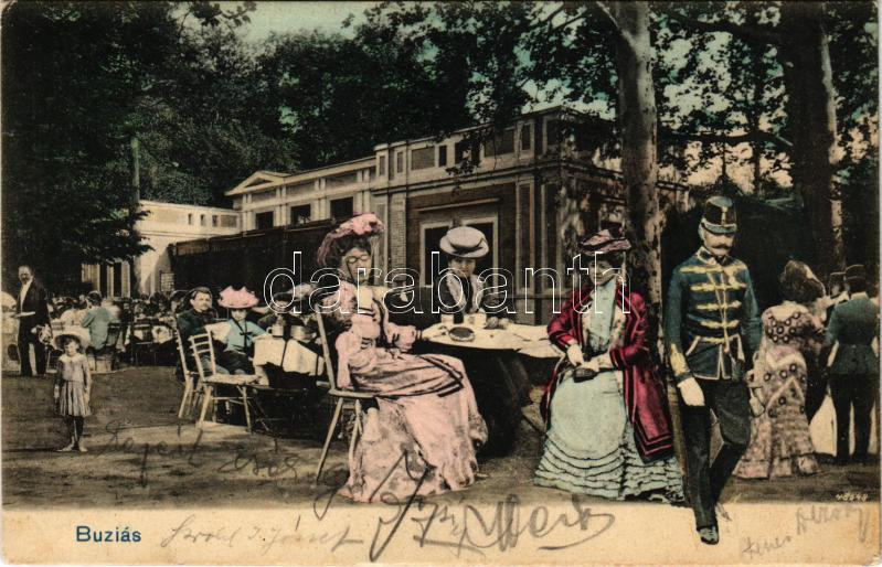 1905 Buziás, gyógyterem kertje. Montázs fürdő vendégekkel / spa garden...