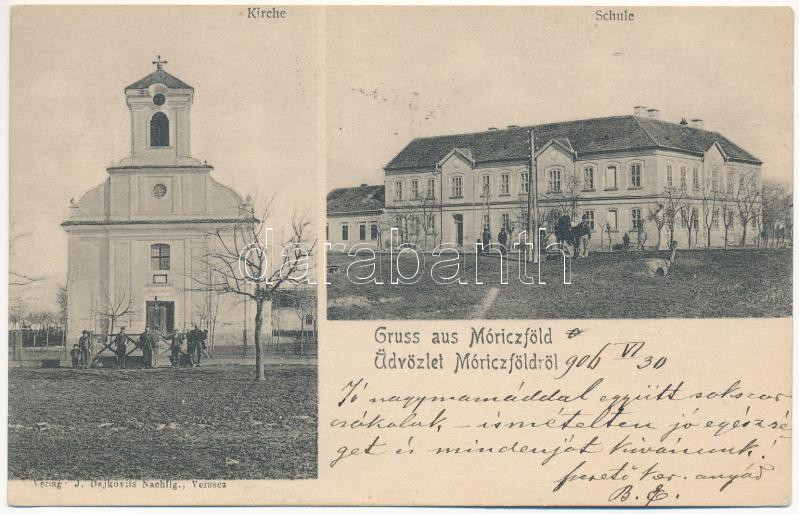 1906 Móricföld, Móriczföld, Moritzfeld, Moritfeld, Maureni; Kirche, Schule / templom és iskola. J. Dajkovits kiadása / church and school (EK)