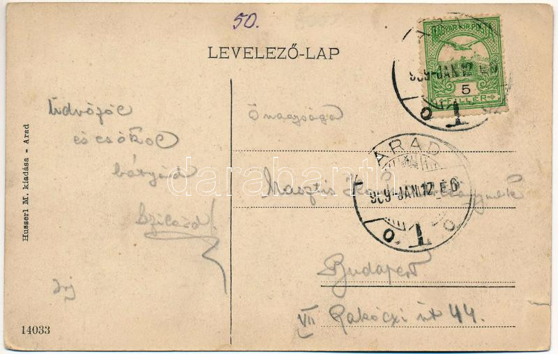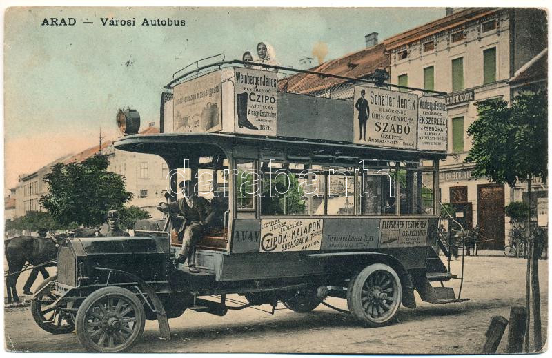1909 Arad, Városi emeletes autóbusz, rajta Berczy Pál, Weinberger János, Schaffer Henrik, Weinberger Ferenc, Pichler Sándor, Fleischer Testvérek üzletének reklámja, Kereskedők Köre. Husserl M. kiadása / double-decker autobus with shop advertisements (EK)