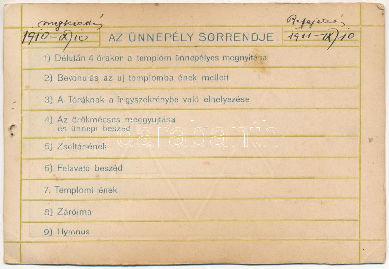 Description: 1911 Nagyszentmiklós, Sannicolau Mare; izraelita templom, zsinagóga (1960-as években lebontották). Tervezte Gráf József építész - Hátoldalon a megnyitó ünnepély sorrendje / syangogue (demolished in the 60's) - opening ceremony schedule on the backside
