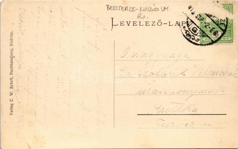 1913 Beszterce, Bistritz, Bistrita; Marktplatz Nordseite, Apotheke / Piac tér északról, C. W. Knopp bazár, Kollmann és Keresztes üzlete, Gyógyszertár. C. W. Schnell könyvkereskedése és saját kiadása / marketplace, bazaar, shops, pharmacy, publisher's shop (Rb)