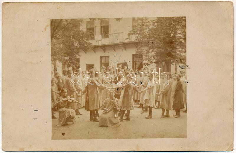 1913 Sepsiszentgyörgy, Sfantu Gheorghe; leány iskola udvara, hegedülő ...