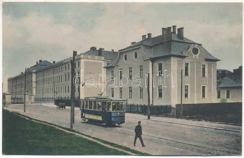 1915 Nagyszeben, Hermannstadt, Sibiu; K.u.K. Infanterie-Kadettenschule / Cs. és kir. gyalogsági hadapródiskola, villamos. Karl Graef kiadása / K.u.K. military infantry cadet school, tram (fl)