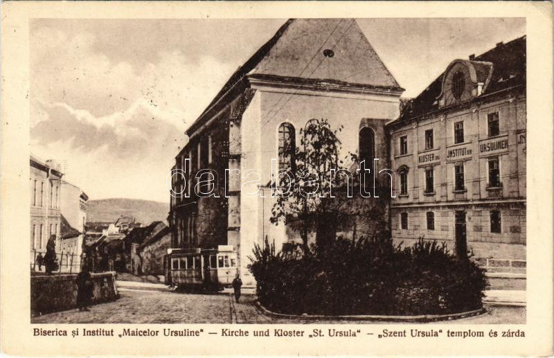 Description: 1930 Nagyszeben, Hermannstadt, Sibiu; Biserica si Institut Maicelor Irsuline / Szent Ursula templom és zárda, villamos. Jos. Drotleff Nr. 105. / church and nunnery, tram (EK)