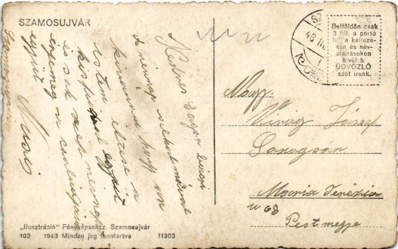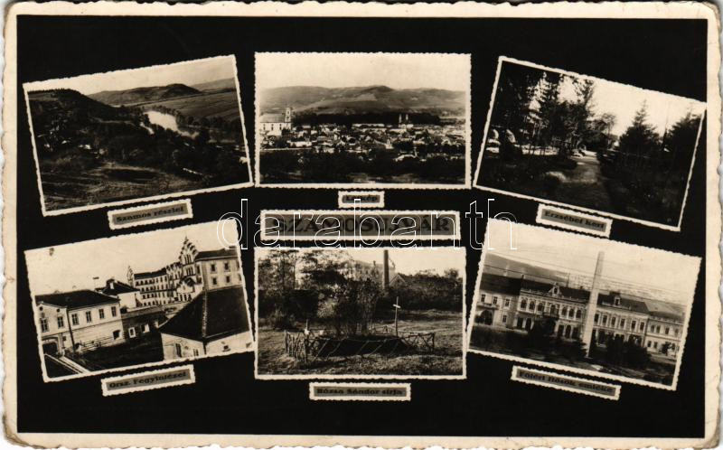 1943 Szamosújvár, Gherla; Szamos részlet, Erzsébet kert, Orsz. fegyintézet, börtön, Rózsa Sándor sírja, Fő tér, Hősök emlékműve / Somes river, prison, tomb, main square, military heroes monument