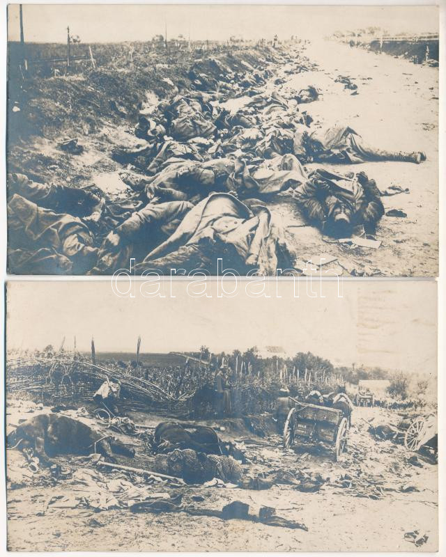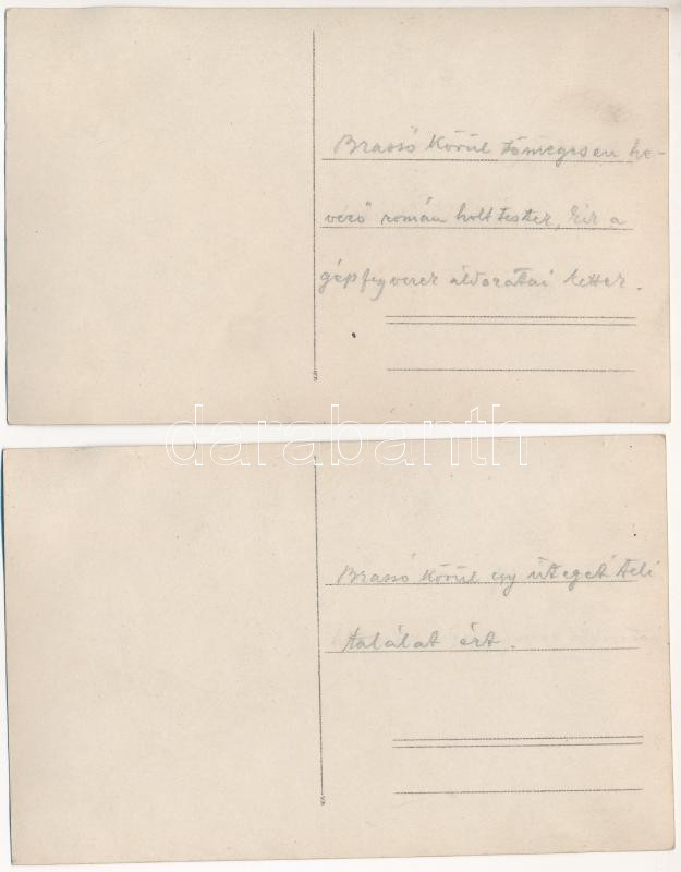Brassó, Kronstadt, Brasov; Die Befreiung Kronstadts, Bei Bartholomä 8. Okt. 1916. / Brassó felszabadítása, halálrajvonal csata, Oláh halott katonák rajvonala a bertalani és brassói vasútállomás között / entry of the German troops, Dead Olah soldiers between the railway stations of Bartolomeu and Brasov - 2 db RÉGI fotó képeslap / 2 pre-1945 photo postcards