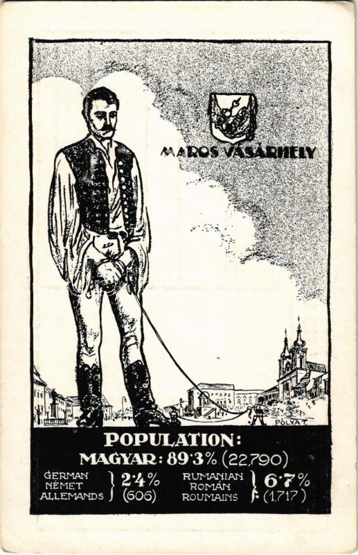 Description: Marosvásárhely, Targu Mures; Magyar, német és román (oláh) nemzetiségek népesség aránya. Címer, Pátria rt. kiadása / Percentage of Hungarian, German and Romanian population. Irredenta art postcad with coat of arms s: Pólya Tibor (EK)