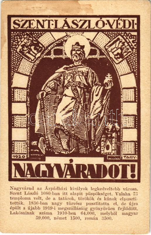 Nagyvárad, Oradea; Szent László védi Nagyváradot! irredenta képeslap. Közművelődési rt. kiadása / Hungarian irredenta propaganda, Ladislaus I of Hungary s: Tary (fl)