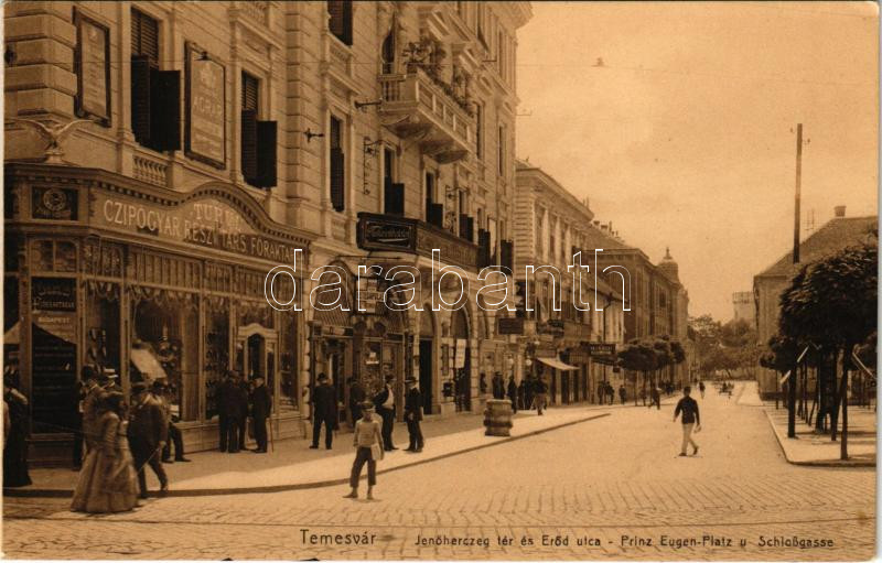 Temesvár, Timisoara; Jenő herceg tér és Erőd utca, Turul cipőgyár részvénytársaság főraktára, Temesi Agrár Takarékpénztár, orvosi és betegápolási cikkek. Uhrmann Henrik kiadása / square, street view, shoe store, savings bank, shops (képeslapfüzetből / from postcard booklet)