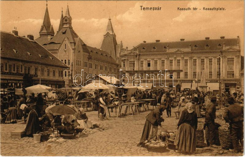 Temesvár, Timisoara; Kossuth tér, piac, Takarékpénztár, Délmagyarországi Jelzálog-Hitelbank, Schneider János, Winternitz Lipót, Goldmann, Haring Gusztáv, Steingaszner Ferenc, Deutsch üzlete. Uhrmann Henrik kiadása / street view, market, bank, shops (képeslapfüzetből / from postcard booklet)