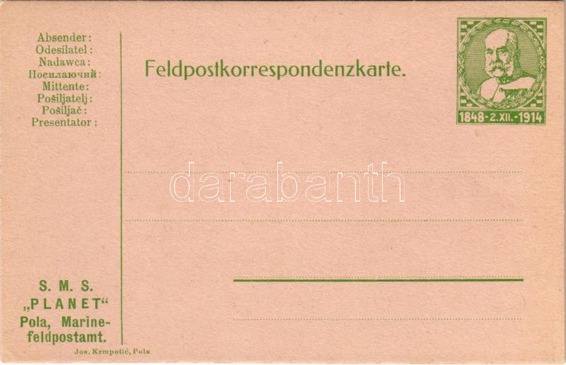 https://www.darabanth.com/en/41-Major-auction/41.1/Postcards/Warship~16973/SMS-PLANET-Feldpostkorrespondenzkarte-Pola-Marinefeldpostamt-Jos-Krmpotic-plus-1848-2XII-1914-~II2965954