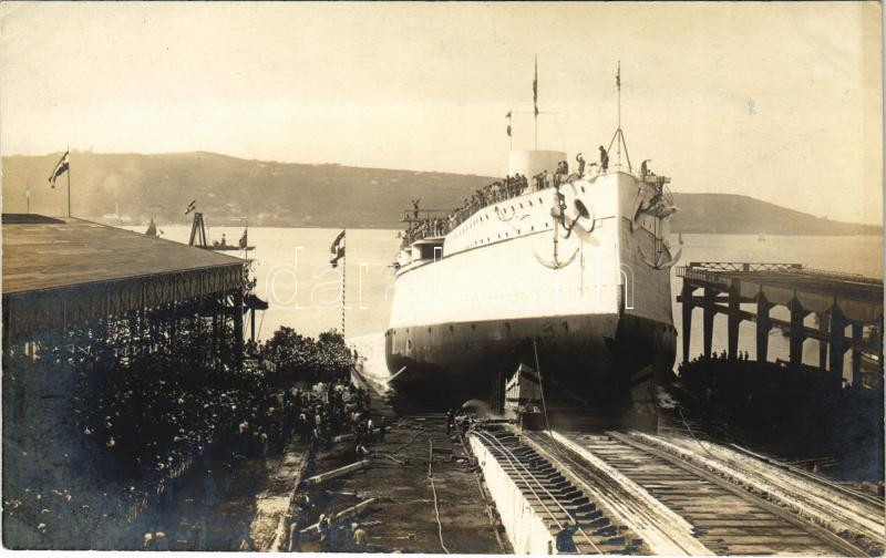 Description: SMS Tegetthoff osztrák-magyar haditengerészet Tegetthoff-osztályú csatahajójának vízre bocsájtása felépítmények és oldalvértezet nélkül / K.u.K. Kriegsmarine Stapellauf / Austro-Hungarian Navy, launching of SMS Tegetthoff without superstructure and side armor. Phot. Alois Beer, Schrinner Pola 1912.