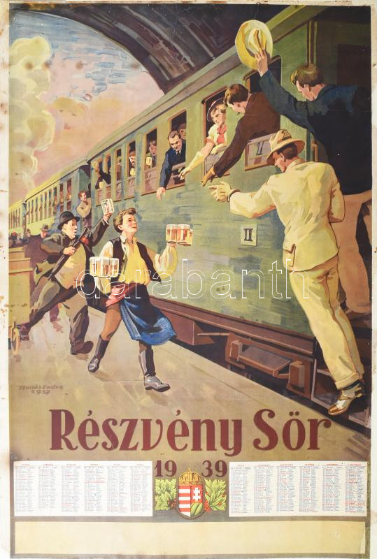 1939 Részvény Sör, nagyméretű falinaptár, Hollós Endre (1907-1946) gra...