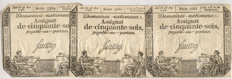 Franciaország 1793. "Assignat" 50Sol (3x) klf. szériaszámokkal T:I-,II+