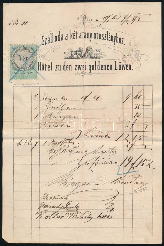 1873 Pest az Arany Oroszlány szálloda fejléces számlája