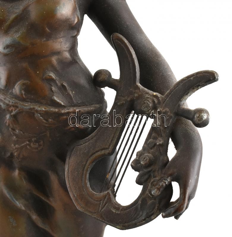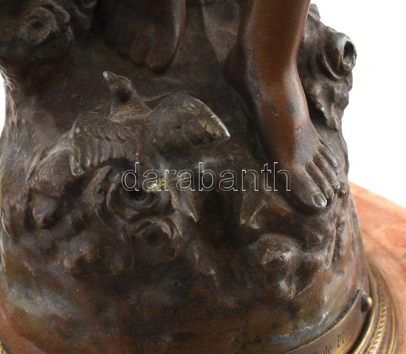 Kandalló óra szett, márvány, bronz rátéttel, egész ütős mechanikus szerkezettel, működik, sérült, ferde, lötyög. m: 42 és 75 cm