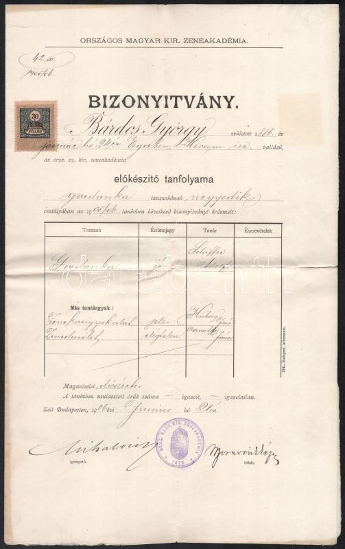 1906 Zeneakadémiai bizonyítvány Mihalovits Ödön zeneszerző, a Zeneakad...