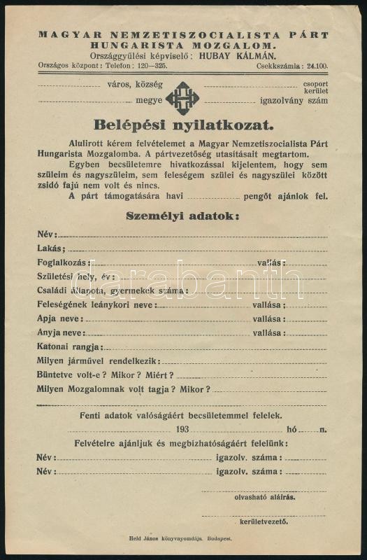 https://www.darabanth.com/en/410-Online-auction/410.0/Art-and-other-collectibles/Documents~500019/1941-Belepesi-nyilatkozat-a-Magyar-Nemzetiszocialista-Partba-Hungarista-mozgalom~II2548079