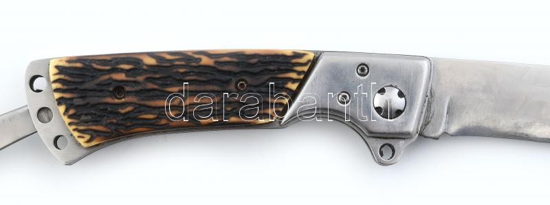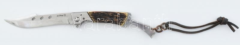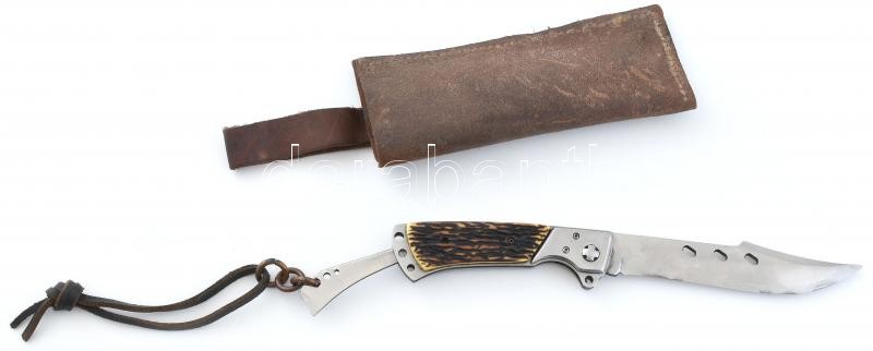 Li Xing összecsukható vadászkés, szaru nyéllel, bőr akasztóval és tokkal, h: 27 cm