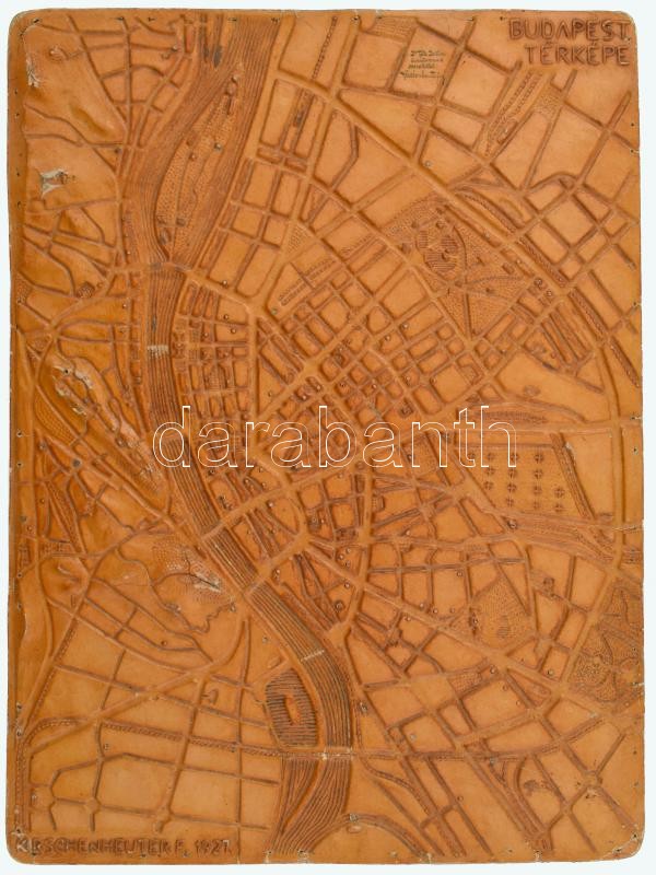 Description: Kirschenheuter Ferenc (?-?), működött a XX. sz. első felében: Budapest térképe, 1927. Vakok számára készült dombornyomott papírmasé térkép, lakkozott, jelzett, Kirschenheuter Ferenc autográf ajándékozási soraival a térkép tetején, kisebb sérülésekkel. 47x35 cm