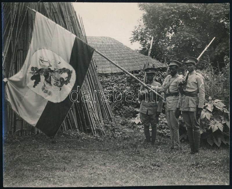 cca 1935 A délnyugat-abesszíniai (Etiópia) hadsereg harci lobogója, rajta Szent Györggyel, feliratozott fotó, 15x12 cm