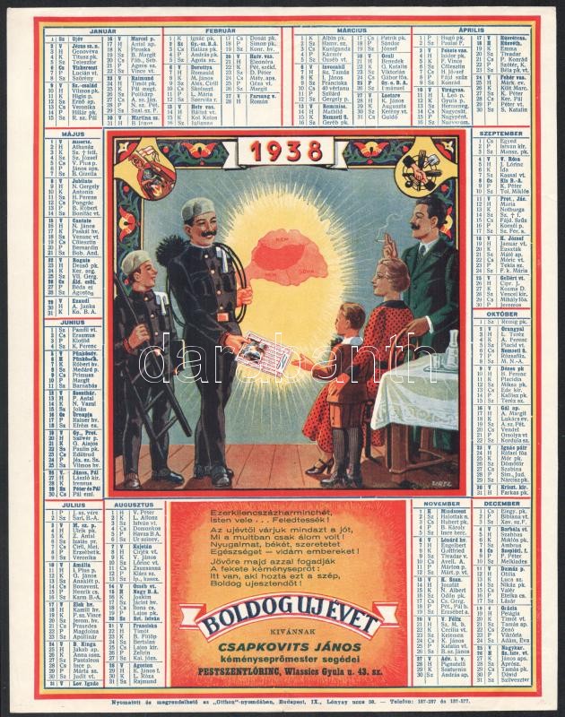 Description: 1938 Irredenta naptár Nagy-Magyarország térképpel és nem, nem, soha felirattal. Csapkovits János kéményseprőmester segédei, Pestszentlőrinc. Otthon nyomda, Bp. Lapszéli egészen apró szakadással, hajtásnyommal. 29,5x23 cm.