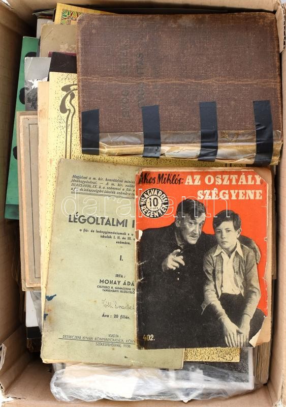 Description: Nagy doboznyi vegyes papírrégiség, benne sok képeslap, kb. 500 db fotó, gyógyszerészet könyv, filléres regény, múzeumi kiadványok, légó kiadvány, stb., érdemes átnézni