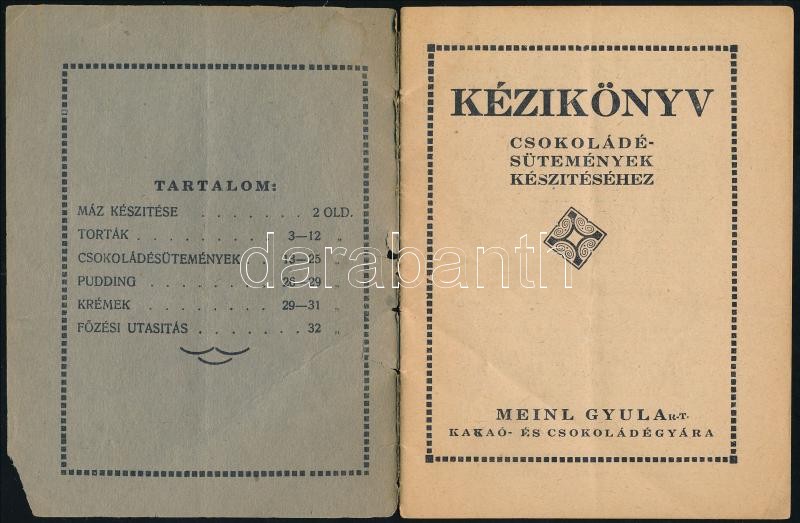 Kézikönyv csokoládésütemények készítéséhez. Bp., én., Meinl Gyula Rt. ... https://www.darabanth.com/en/410-Online-auction/410.0/Books/Books-Gastronomy-and-Gardening~1000011/Kezikonyv-csokoladesutemenyek-keszitesehez-Bp-en-Meinl-Gyula-Rt-Kakao-es-Csokola~II2550379