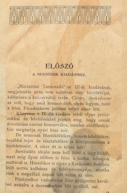 Lakos Imréné Pécskay Ilona: Háztartási tanácsadó. Nagybánya, 1913, a szerző kiadása, 588 p. Negyedik kiadás. Átkötött félvászon-kötés, kissé sérült, kopott borítóval, hiányzó címlappal, a lapok egy része javított (a szöveg olvasható), helyenként kissé foltos lapokkal.