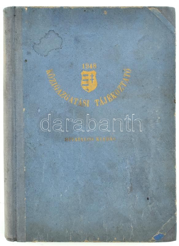 Közigazgatási Tájékoztató 1948. Magyarország községhatáros alaptérképe, jelkulcsa és közigazgatási tájékoztató. Összeáll.: az Országos Rendőri Bejelentő Hivatal. Bp., 1948., (Szikra-ny.), 366 p. Térkép nélkül. Kiadói kopott félvászon-kötés.
