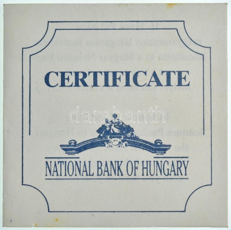 Description: 1991. 10.000Ft Au "II. János Pál pápa látogatása" dísztokban, tanúsítvánnyal (7,02g/0.986) T:PP Hungary 1991. 10.000 Forint Au "Visit of Pope John Paul II" in original case with certificate (7,02g/0.986) C:PP Adamo EM121, Krause KM#684