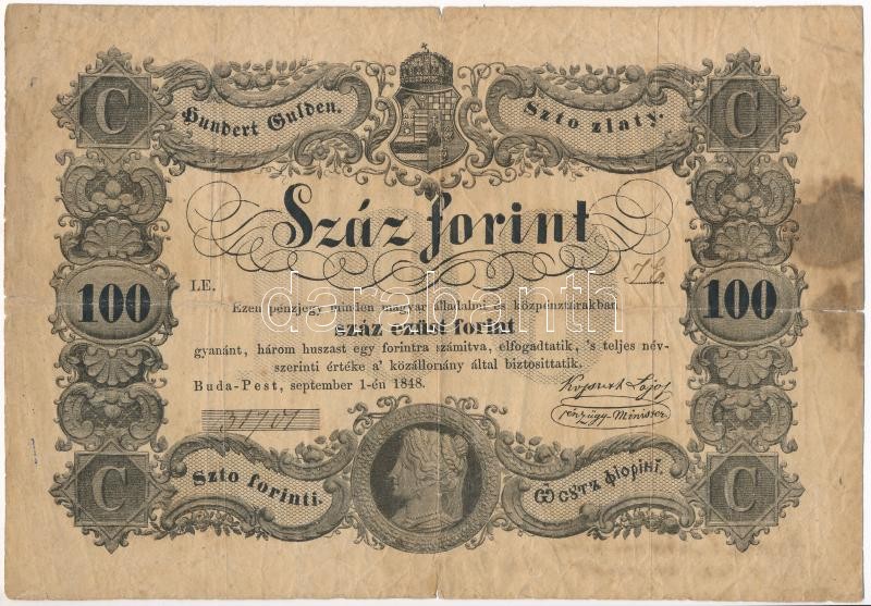 1848. 100Ft "Kossuth bankó" hátoldalán fekete tintával és au... https://www.darabanth.com/en/410-Online-auction/410.0/Numismatics/Hungarian-Banknotes~2000007/1848-100Ft-Kossuth-banko-hatoldalan-fekete-tintaval-es-augusztus-9-i-datummal-irt-adomany~II2549792