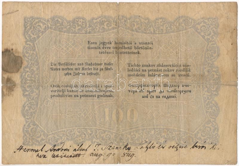 Hungary 1848. 100Ft "Kossuth banknote" donor text wrote with black ink on the back, dated 9th August C:VG tears, spotted