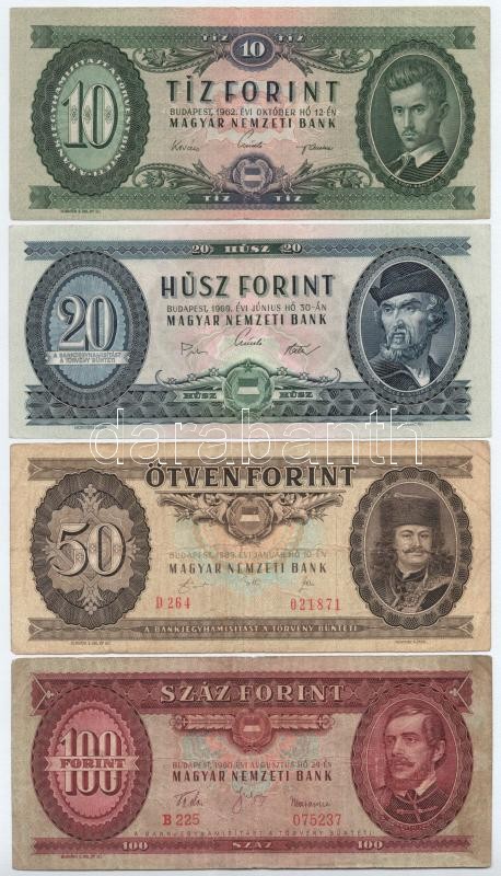 https://www.darabanth.com/en/410-Online-auction/410.0/Numismatics/Hungarian-Banknotes~2000007/1960-100Ft-plus-1962-10Ft-plus-1969-20Ft-1989-50Ft-TIII~II2544752