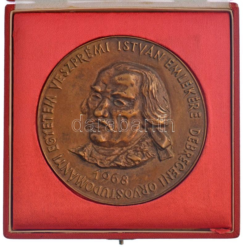 Description: 1968. "Veszprémi István emlékére - Debreceni Orvostudományi Egyetem 1968" egyoldalas, öntött bronz emlékérem, eredeti sérült dísztokban. Szign.: DL (106mm) T:1-