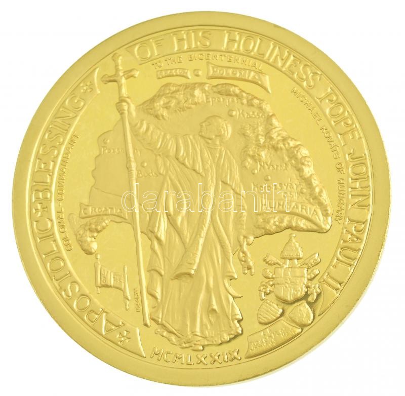 1979. "Szent László király / Őszentsége II. János Pál pápa apostoli áldása" a Kováts Mihály Egyesület által az amerikai függetlenségi háború 200. évfordulójára Amerikában kiadott aranyozott bronz emlékérem sorozat darabja, kapszulában (51mm) T:PP Hungary 1979. "Saint Ladislaus / Apostolical Blessing of His Holiness Pope John Paul II" gold plated bronze commemorative medallion of the Col.-Commandant Michael Kovats Historical Society, USA (51mm) C:PP