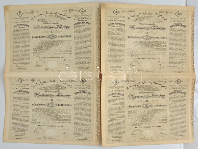 Budapest 1906. "A Magyar Jelzálog-Hitelbank" nyereménykötvény 100K-ról "A" és "B" sorozat egyben (2x) sorszámkövetők, francia-magyar-német nyelven, szárazpecséttel T:II-