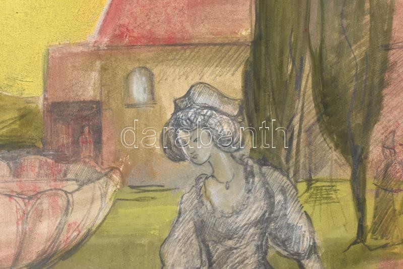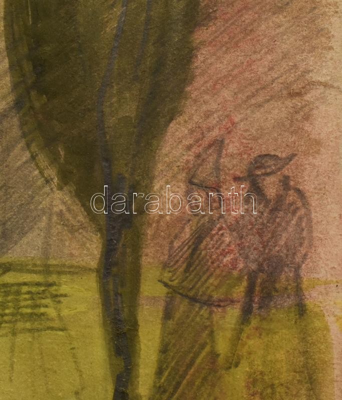 Gulácsy L jelzéssel: Kerti séta. Akvarell, ceruza, karton, bal szélén ragasztás nyomaival, foltos, hullámos, 38,5×33 cm