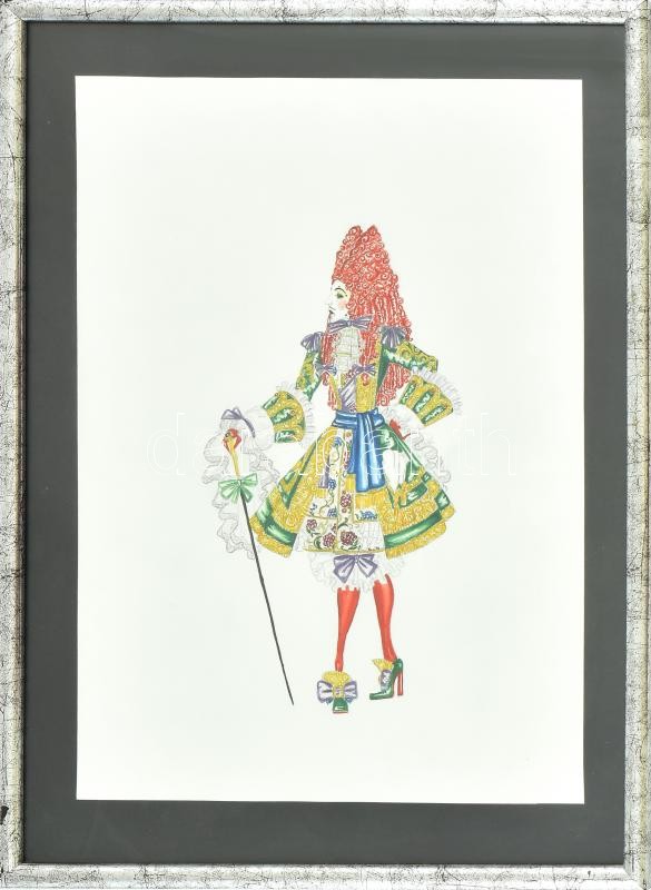 Jelzés nélkül, feltehetően a XX. sz. második felében működött magyar művész: Jelmezterv (férfi). Akvarell, ceruza, papír, üvegezett keretben. 42×28 cm.