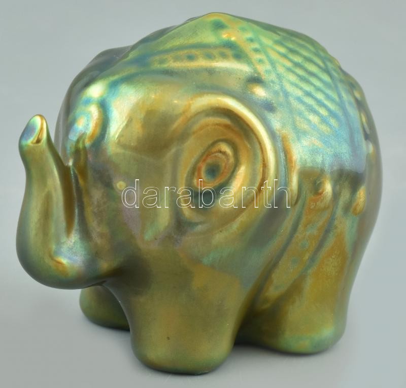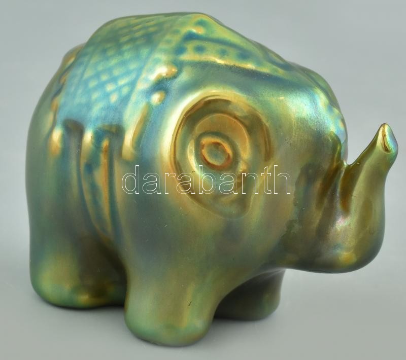 Zsolnay porcelán elefánt, eozin mázas, jelzés nélkül, apró mázrepedése...